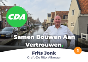 Mijn naam is Frits Jonk, 59 jaar oud en de eerste helft van mijn leven opgegroeid, gewerkt, en genoten van mijn jeugd in Schermerhorn.Mijn middelbare school op het PCC in Oudorp, De Fabritiusstraat en de Blekerskade. Tegenwoordig na 5 jaar De Rijp, nu al weer ruim 25 jaar in Graft met mijn achtertuin grenzend aan De Eilandspolder. . Dit samen met mijn vrouw Anja en mijn onze dochter Ilja en zoon Jauke. Ik ben lid van het CDA omdat ik als raadslid alle inwoners van onze gemeente wil vertegenwoordigen; vanuit mijn groene Tuinbouw opleiding ben ik begaan alles in de buitengebieden en duurzaamheid. Voor Alkmaar wil ik graag en prettige en veilig stad en ommelanden. Waar ondernemers en inwoners graag wonen werken en recreëren en vrijheid hebben zonder teveel regels.